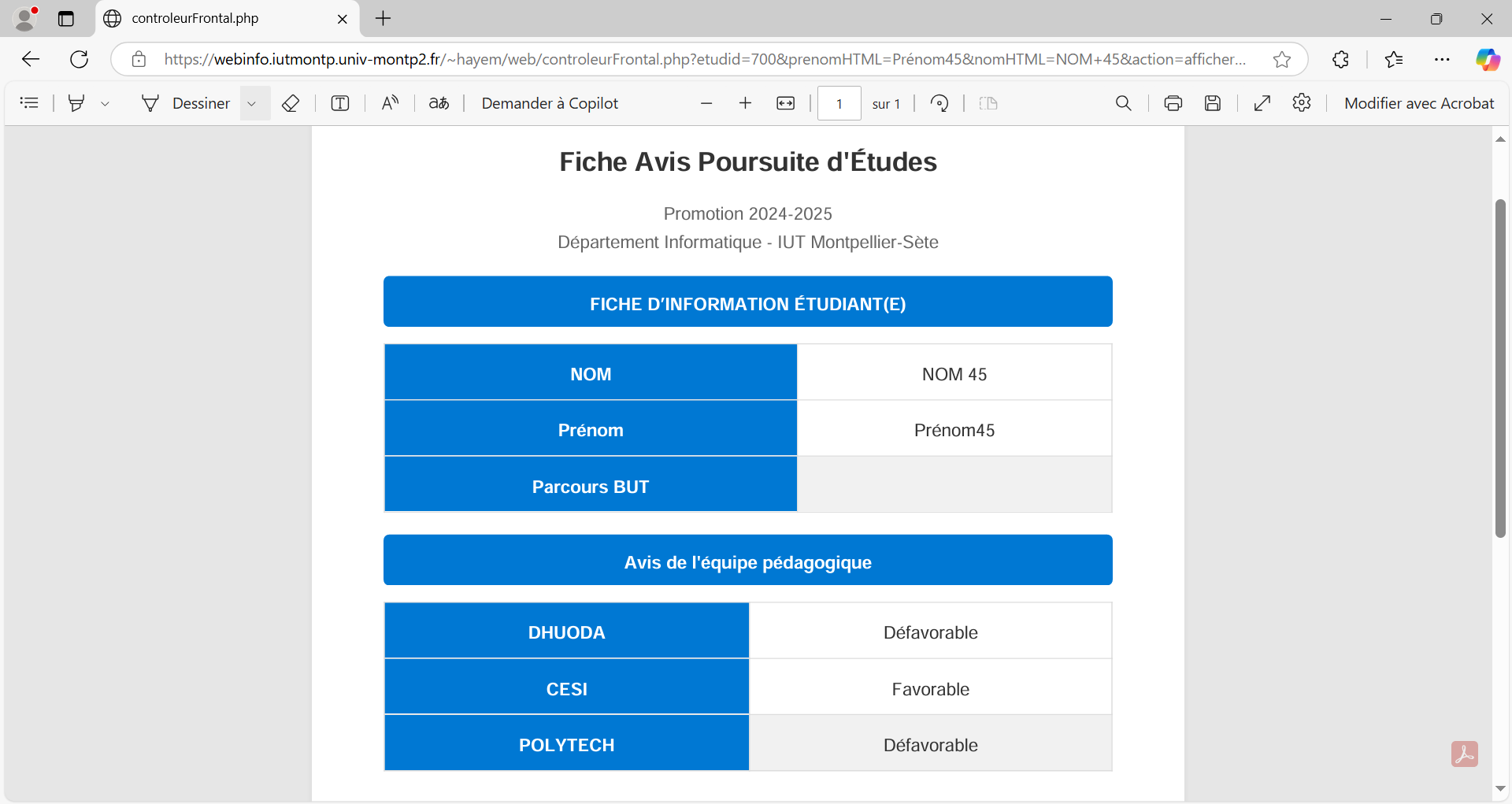 Cependant, il n’y a actuellement pas de logiciel permettant aux jurys, enseignants et écoles recrutantes de facilement analyser / comparer ces résultats à la fin de l’année. L'IUT a donc besoin d'une plateforme web sécurisée pour gérer la poursuite d'étude des étudiants.